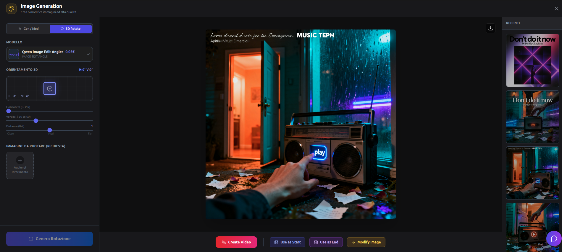 La funzionalità di rotazione 3D delle immagini con AI di Alice Studio consente di trasformare una singola immagine statica in una rappresentazione tridimensionale dinamica, capace di mostrare il soggetto da angolazioni differenti e realistiche, senza la necessità di modellazione manuale o riprese multiple.